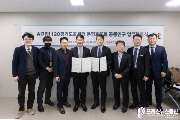 경기도와 ㈜KT는 17일 경기도청에서 인공지능(AI) 기반 120경기도콜센터 운영 효율화 공동연구의 성공적 추진을 위해 업무협약을 체결했다. 협약식에는 유태일 자치행정국장, 성원제 KT강남법인고객본부장 등 관계자 10여 명이 참석했다.