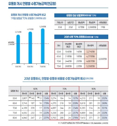 만약 30세부터 20년 동안 매월 8만 7000원씩 총 2088만 원을 납입해 사망보험금 1억 원 보험계약을 보유한 가입자가 3000만 원만 사망보험금으로 남겨놓고 55세부터 연금으로 당겨받는 경우 월 평균 14만 원을 수령할 수 있게 된다. 연금 수령 시점을 75세로 늦출 경우 월 22만 원으로 늘어난다.