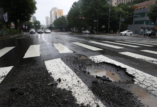 | ▲지난 7월 18일 호우로 인해 서울 시내 도로에 도로파임 현상이 발생한 모습.(사진= 뉴스1) |