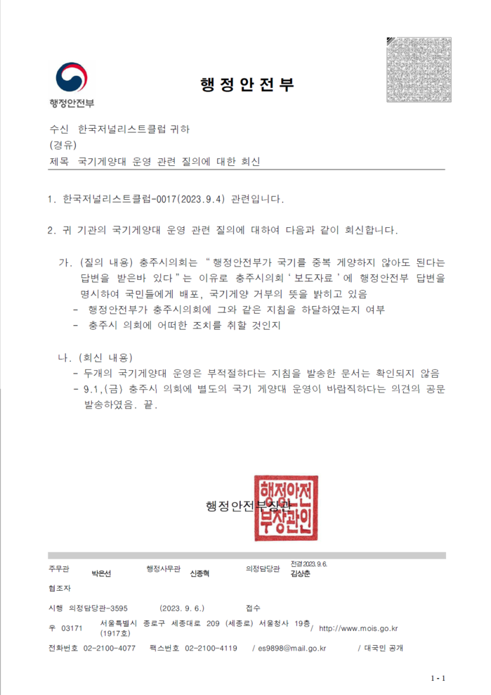 또한, 행안부는 9월 1일 자 공문으로 “충주시의회에 별도의 국기 게양대 운영이 바람직 하다는 의견의 공문을 발송하였다”고 밝혔습니다다.