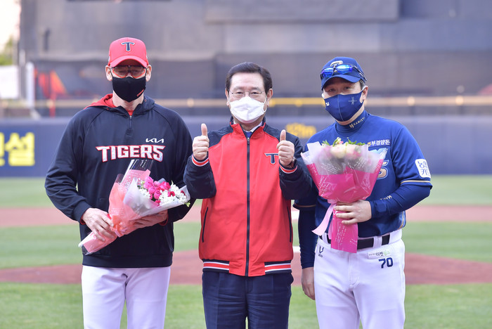 이용섭 광주광역시장(가운데)이 9일 오후 광주-KIA 챔피언스필드에서 열린 2021 KBO프로야구 KIA타이거즈와 NC다이노스의 홈 개막전에 참석해 맷 윌리엄스 KIA 타이거즈 감독(왼쪽)과 이동욱 NC 다이노스 감독(오른쪽)에게 꽃다발을 전달한 뒤 기념촬영을 하고 있다