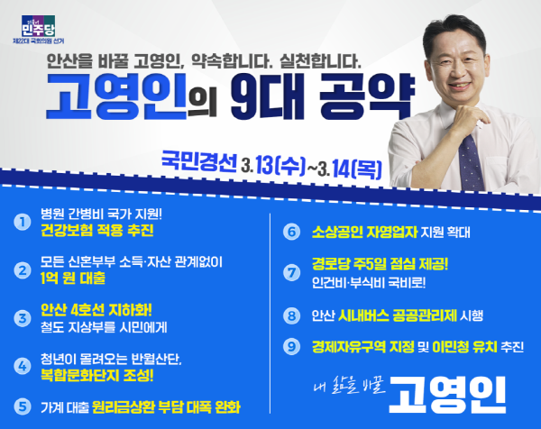 9개 공약을 발표한 고영인 예비후보는 “약속은 누구나 한다. 하지만 의지가 있어도 실력이 없으면 시민들께 결과적으로 거짓말을 하게 되어 정치 혐오를 양산한다. 공약 발표에 앞서 지킬 수 있는 약속을 세심하게 다듬었다.”고 말하고 “깨끗하고 실력있는 고영인이 국민 삶을 지키고 안산의 재도약을 반드시 현실로 만들겠다. 적임자는 바로 고영인이다”며 포부를 밝혔다.