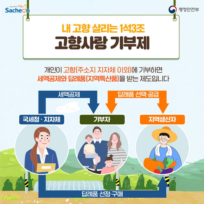한편, 고향사랑기부제는 사천에 주소를 두지 않은 사람이 사천시에 기부하면 이를 주민 복리 증진 등에 사용하고, 기부자에게는 세액공제 혜택과 함께 답례품을 제공하는 제도다.