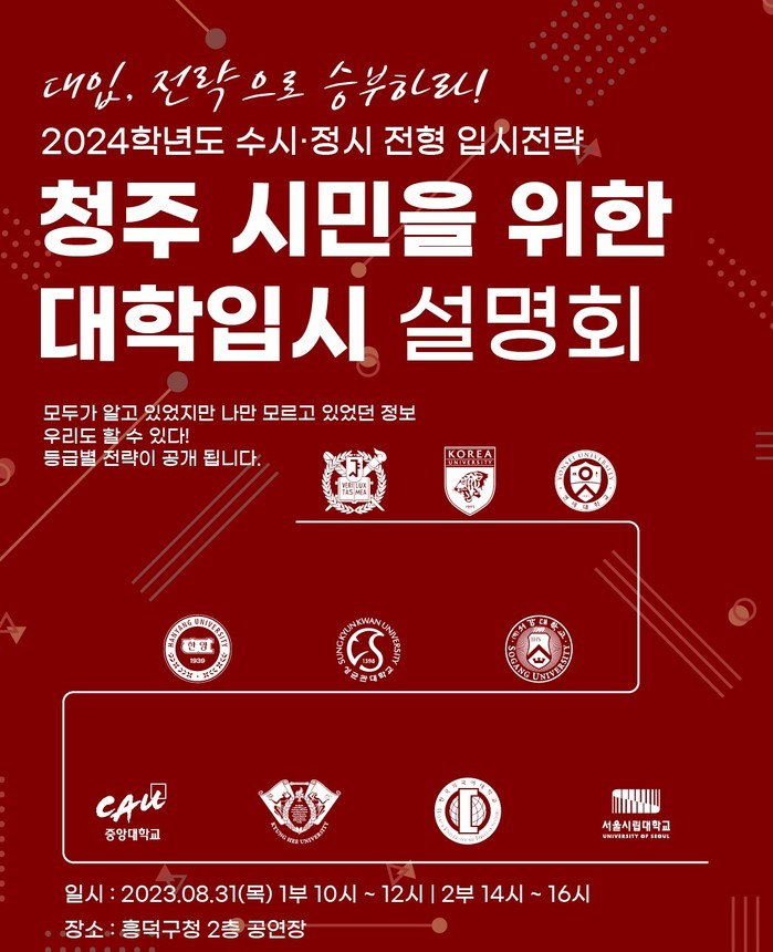 오는 8월 31일 청주시 흥덕구청 2층 공연장에서 오전 10시~12시 고교학점제 준비에 대한 전략과 정보를, 오후 2시~4시에는 대입 수시 정시를위한 입시설명회를 제공할 예정이다.