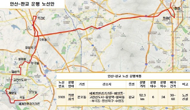 신설된 3103번 노선은 본오동 정비단지를 출발해 명휘원→자이아파트→푸르지오6·7·9차아파트→고잔신도시→중앙역→안산시외버스터미널→성포동 선경아파트→월피현대아파트→부곡동행정복지센터→안산고·수암파출소를 거쳐 판교 제2테크노밸리까지 운행된다.