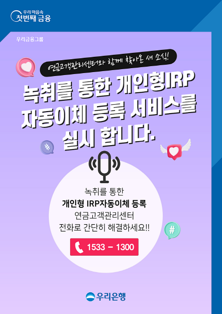 [프레스뉴스] 김대일 기자= 우리은행(은행장 이원덕)은 ‘개인형 퇴직연금 IRP 자동이체 녹취 간편등록 서비스’를 은행권 최초로 도입했다고 13일 밝혔다.
