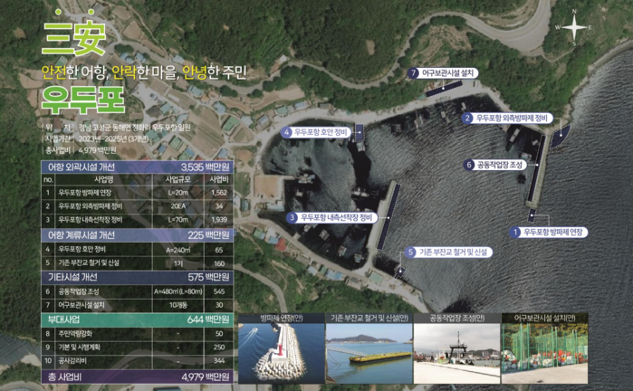 어항 외곽시설 개선을 위해 우두포항 방파제 연장, 외측방파제 정비, 내측 선착장 정비를 하고, 어항 계류시설 개선을 위해 우두포항 호안을 정비할 뿐만 아니라 공동작업장과 어구보관창고도 설치할 계획이다.