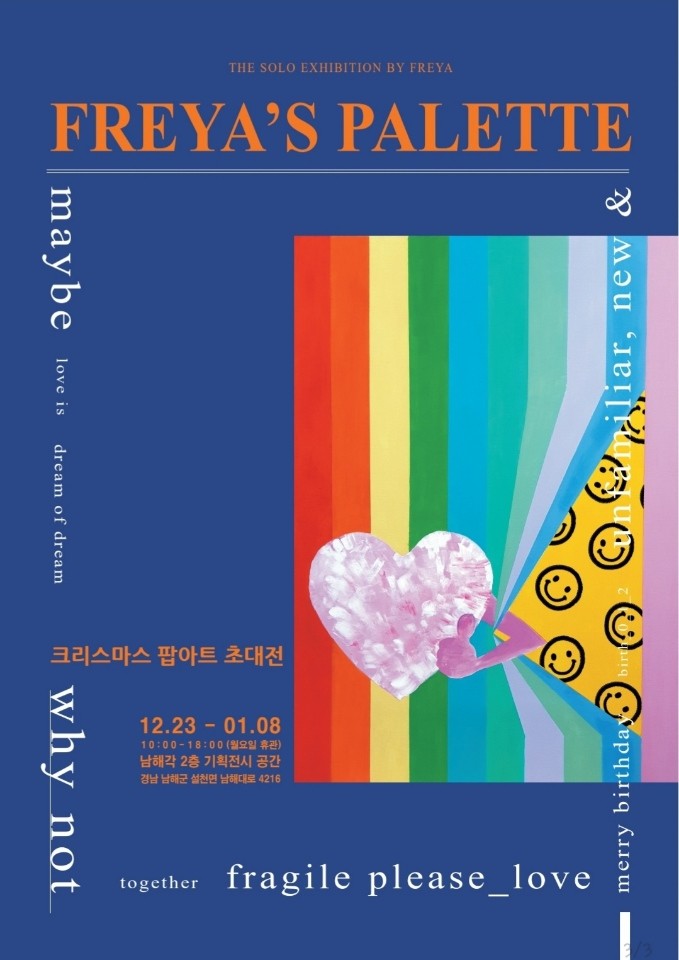 ‘프레야의 팔레트 展’은 오는 23일(금)부터 내년 1월 8일(일)까지 총 2주간, 남해각 2층 기획 전시실에서 만날 수 있다. 남해각 운영 시간은 월요일을 제외한 오전 9시부터 18시까지다.