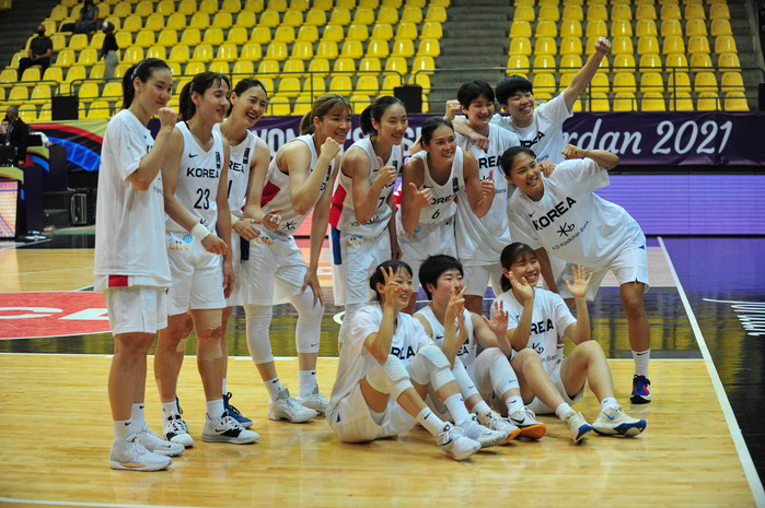 [프레스뉴스] 채정병 특파원= 30일(현지시간) 요르단 암만에서 열리고 있는 국제농구연맹(FIBA) 아시아컵 여자농구 4강 진출 결정전에서 우리나라가 대만을 80대74로 꺾으며 4강에 진출한 가운데 경기 종료 후 우리선수들이 기념사진을 찍고 있다.