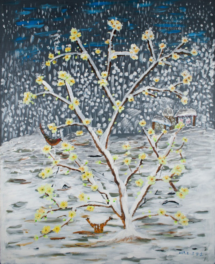 | ▲ 설천면 눈내목욕탕미술관에서 열리는 고창선 개인전 작품- <눈 쌓인 매화>(사진=남해군) |