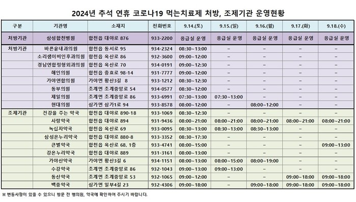 또한 추석연휴 기간 내 코로나19의 원활한 진단과 치료를 위해 권역별 처방기관 및 조제기관을 운영한다. 먹는치료제 수급의 원활한 조정으로 연휴기간 운영하는 조제기관에 충분히 공급될 수 있도록 하여 군민의 불편을 최소화하겠다고 밝혔다.