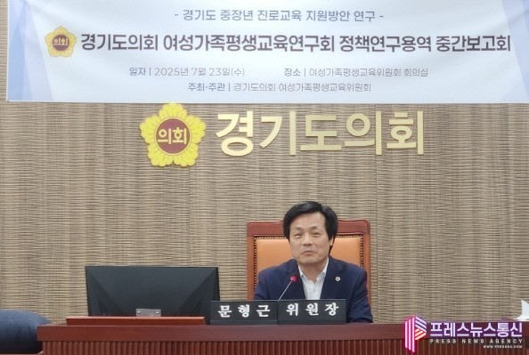 [프레스뉴스] 류현주 기자= 경기도의회 여성가족평생교육연구회(회장 문형근, 여성가족평생교육위원장)는 7월 23일(수) 오후 2시 30분, 경기도의회 여성가족평생교육위원회 회의실에서 「경기도 중장년 진로교육 지원방안 연구」 중간보고회를 개최하였다.