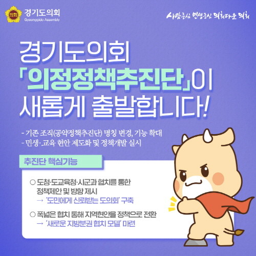 한편, 경기도의회는 지난해 11월 1일 ‘경기도의회 기본 조례’ 제1조(목적) 및 제6조(의회의 역할)에 근거해 염 의장 취임공약에 기반한 의정지원 조직인 ‘공약정책추진단’을 구성했다.