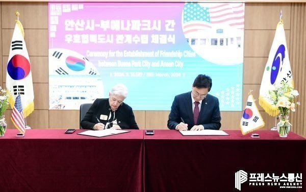 [프레스뉴스] 장현준 기자= 안산시(시장 이민근)는 미국 부에나파크시(시장 수잔 손, Susan Sonne)와 교육, 문화, 경제, 체육 등 다양한 분야에 걸쳐 협력을 약속하는 ‘우호협력도시’ 협약을 체결했다고 16일 밝혔다.