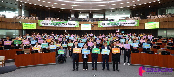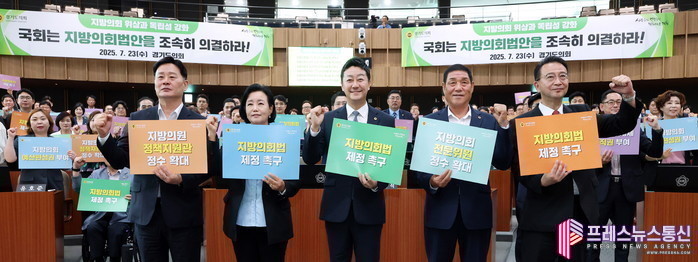 [프레스뉴스] 류현주 기자= 경기도의회(의장 김진경)는 23일 제385회 제2차 본회의 직후 결의대회를 열고 지방의회의 위상과 독립성 강화를 위한 ‘지방의회법안’의 조속한 국회 의결을 촉구했다.