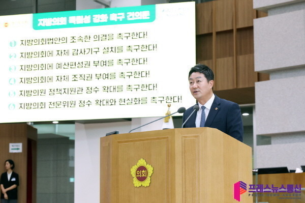 백현종 국민의힘 대표의원은 “지방의회는 헌법상 기관이지만 지방자치법에 따라 집행기관에 예속된 형태로 운영되는 실정”이라며 “지방의회의 독립을 위해서는 ‘지방의회법 제정’이 바로 답”이라고 밝혔다.