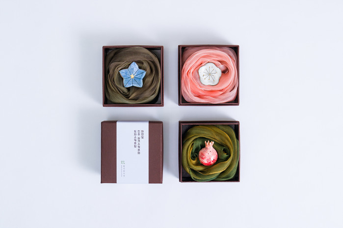 ▲ 제11회 진주시 관광기념품 공모전에서 대상을 수상한 황선회 씨의 ‘자연빛 진주실크와 도자스카프링’(진주시 제공) |