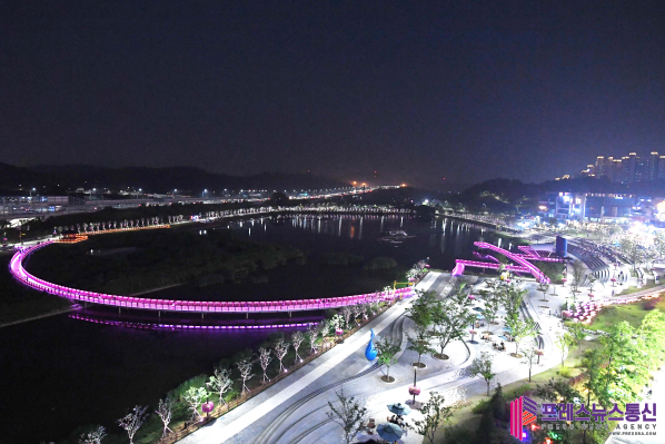 | ▲한여름 밤, 호숫가를 가로지르는 나무 덱이 수려한 불빛으로 반짝이는 시흥 은계호수공원(사진=시흥시) |
