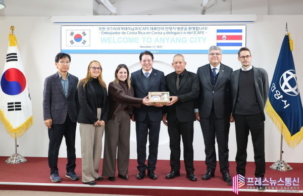 [프레스뉴스] 장현준 기자= 안양시는 최대호 시장이 지난 17일 오전 11시40분 안양시청 3층 접견실에서 호르헤 엔리케 발레리오 에르난데스 주한코스타리카 대사와 코스타리카 커피 산업을 총괄하는 공식 연구·관리 기관인 코스타리카 커피연구소(ICAFE) 대표단을 접견하고, 양국 지방정부 간 실질적 교류 확대 방안을 논의했다고 18일 밝혔다.