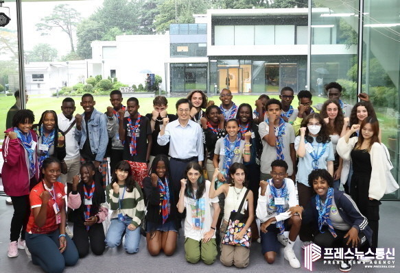 | ▲ 10일 오후 도담소에서 김동연 경기도지사, 세계스카우트잼버리 참가자 등이 기념촬영을 하고 있다.(사진=경기도) |
