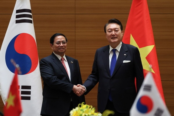 | ▲ 주요 7개국(G7) 정상회의에 참석한 윤석열 대통령과 팜 밍 찡 베트남 총리가 5월19일 일본 히로시마에서 정상회담에 앞서 악수를 하고 있다.(대통령실 제공) |