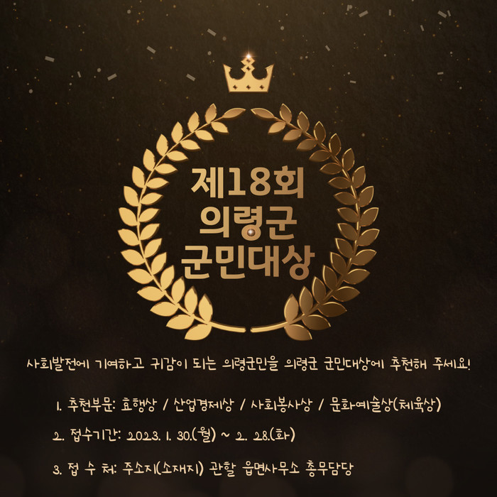 | ▲ 의령군은 내달 28일까지 제18회 의령군 군민대상 후보자를 추천받는다.(의령군 제공) |