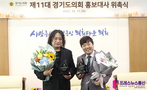 | ▲ 제11대 경기도의회 홍보대사 위촉식(왼쪽부터 가수 신대철, 개그맨 김성규)사진=경기도의회 |