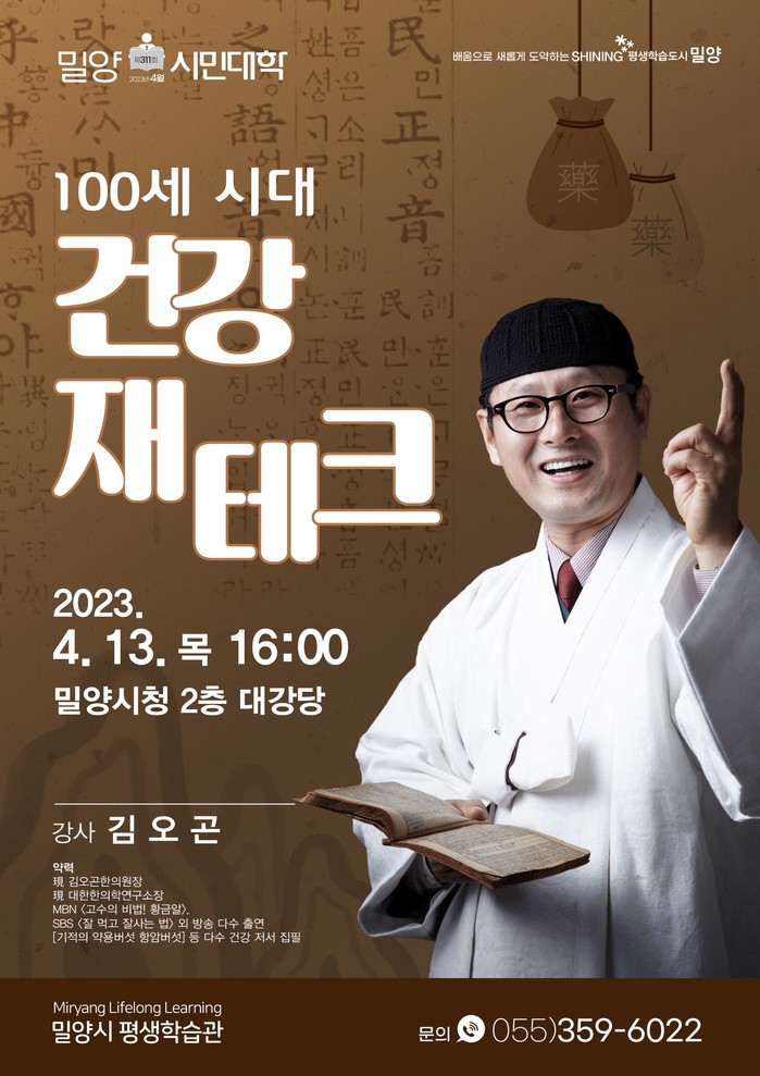 4월 밀양시민대학의 강연자는 건강 전도사와 노래하는 한의사로 유명한 김오곤 원장이다. 김오곤 원장은 동국대학교 한의학 석사를 졸업하고 대한한의학연구소장, 한국건강음식연구소장, 대장금 의료봉사단 단장을 역임한 건강 분야의 명사이며, MBN<고수의 비법! 황금알>, SBS<잘먹고 잘사는 법>, KBS<건강백세인 생방송투데이> 등 다수 방송 프로그램에 출연한 적 있다.