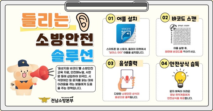 ‘들리는 소방안전 솔루션’은 우리말에 익숙하지 않은 외국인과 정보 접근이 어려운 장애인의 위기 대응 능력 향상을 목표로 추진된 사업으로, 스마트폰 애플리케이션 ‘보이스아이(VoiceEye)’를 활용한 음성 및 다국어 정보 제공 방식이 특징이다.