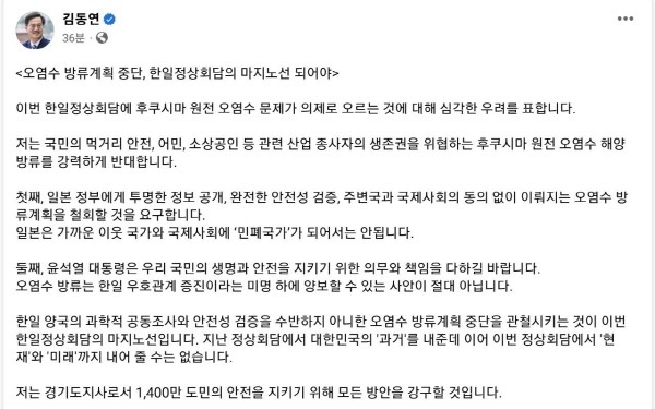 [프레스뉴스] 장현준 기자= 김동연 지사는 4일 ‘오염수 방류계획 중단, 한일정상회담의 마지노선 되어야’라는 입장문 SNS을 통해 이같이 밝혔다.