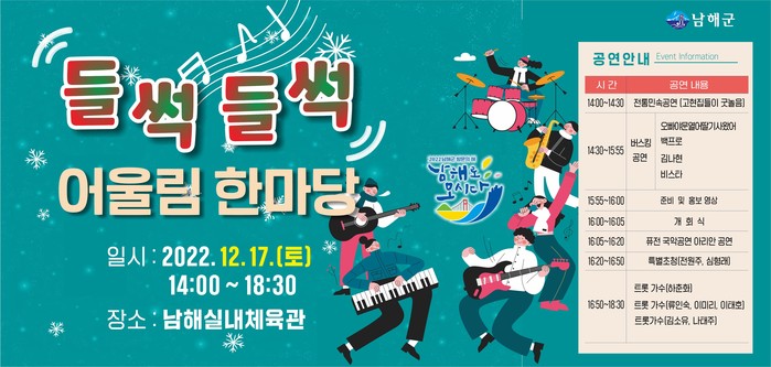 당초 지난 11월 5일 열릴 예정이었으나 국가 애도기간에 동참하면서 잠정 연기된 바 있다. 이번 행사는 2022년 남해군 방문의 해에 적극 동참한 군민들의 노고를 위로하고 한 해를 잘 마무리하기 위해 개최된다.