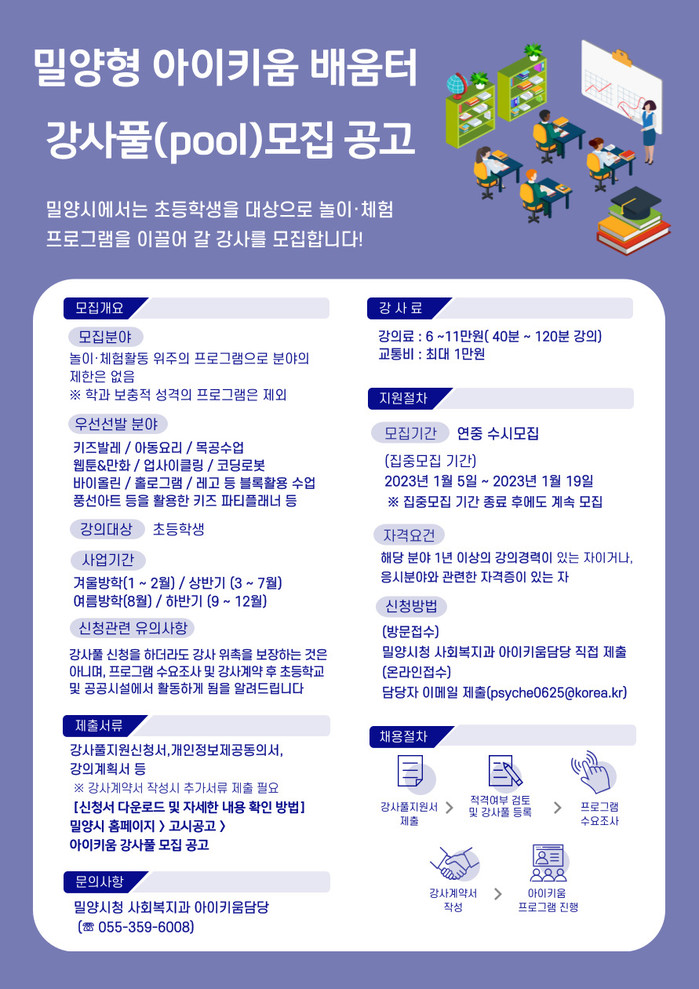 [프레스뉴스] 정재훈 기자= 밀양시는 아이키움 배움터에서 초등학생을 대상으로 놀이·체험 프로그램을 이끌어 갈 강사를 오는 19일까지 강사풀(pool)로 모집한다고 밝혔다.