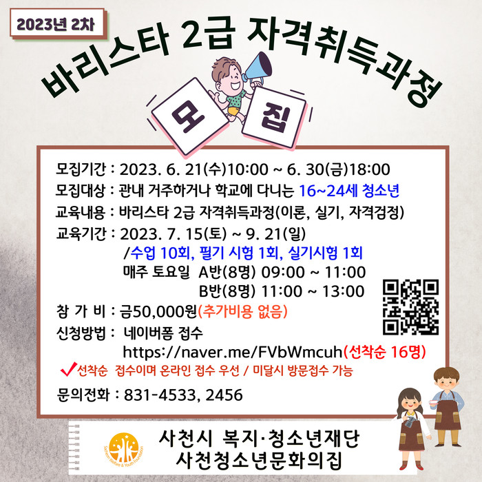 [프레스뉴스] 정재훈 기자= 사천시 복지·청소년재단 소속 사천청소년 문화의집은 관내 청소년들의 건전한 여가 확보와 진로 탐색에 도움을 주고자 ‘바리스타 2급 자격취득과정’ 2차 수강생을 모집한다.