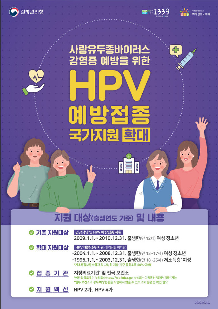 현재 국가예방접종사업으로 만 12~17세(2005~2011년생)의 모든 여성청소년과 만 18~26세(1996~2004년생)의 기초생활보장수급자와 차상위계층 등 저소득층 여성은 무료로 HPV 예방접종을 받을 수 있다.