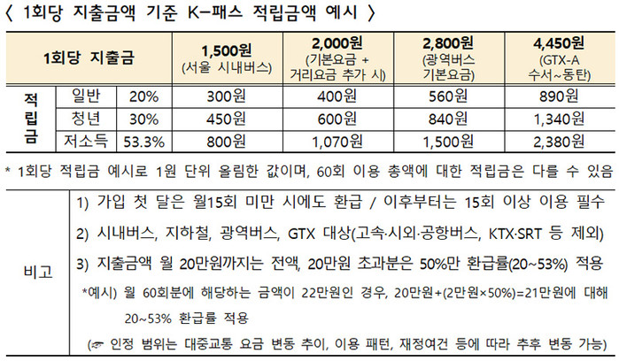 K-패스로 대중교통을 월 15회 이상 이용하는 만19세 이상 성인은 월(매월 1일~말일) 최대 60회분에 해당하는 대중교통비의 20~53.3%를 적립해 다음 달에 환급받을 수 있다. 적립률은 일반(만 35세 이상) 20%, 청년(만 19~34세) 30%, 저소득(기초생활수급자·차상위) 53.3%로 상이하다.