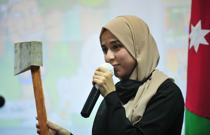 [프레스뉴스] 채정병 특파원=25일(현지시간) 한글의 우수성을 알리고 한국전통문화체험을 겸한 575돌 한글날 기념행사가 요르단 암만세종학당 주최로 요르단 대학교에서 열린 가운데 '한국사람처럼 동화 이야기하기 대회'에 참가한 여성이 소품을 이용해 전래동화 '금도끼 은도끼'를 구연하고 있다.