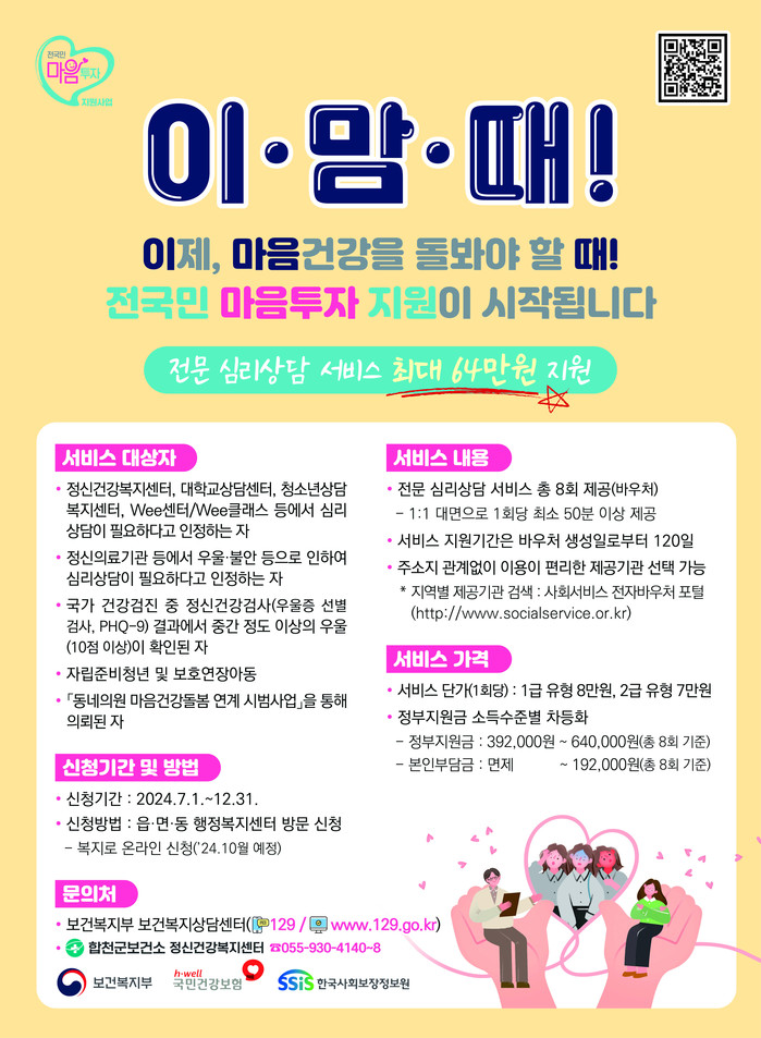 ‘전국민 마음투자 지원사업’은 우울·불안, 이상동기 범죄 등 정신건강 문제가 날로 심각해지는 현실을 반영하여, 정신건강에 어려움을 겪는 전 국민이 전문 심리상담 서비스를 받을 수 있도록 지원하는 사업이다.