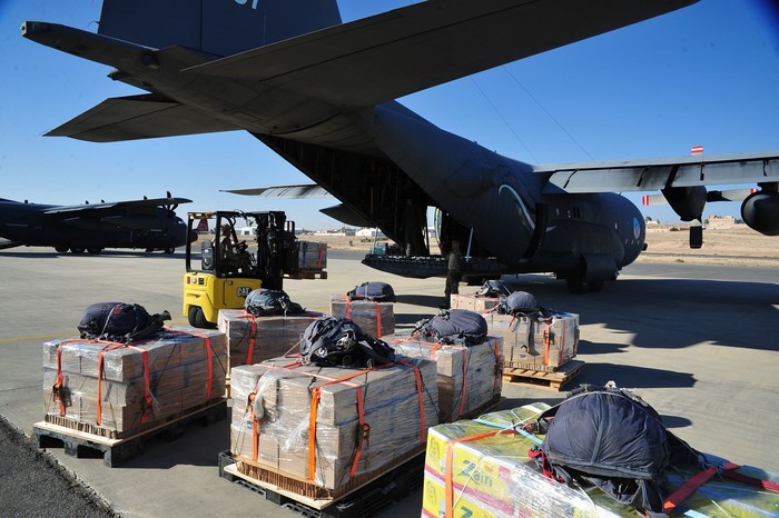 [프레스뉴스] 채정병 특파원= 5일(현지시간) 심각한 기아와 영양실조에 직면한 가자지구 주민들을 위해 요르단군을 비롯한 UAE, 독일, 프랑스 수송기가 육로로 접근이 어려운 가자 중부지역에 분유 등의 생존식량을 싣고 에어드롭(공중투하)을 수행한 가운데 요르단 킹 압둘라 2세 공군기지 활주로에 수송기에 실을 물품들이 도열해 있다. 전쟁 이후 지금까지 하늘길을 통한 에어드롭은 총 289회, 305톤에 달하는 구호품이 전달됐다.