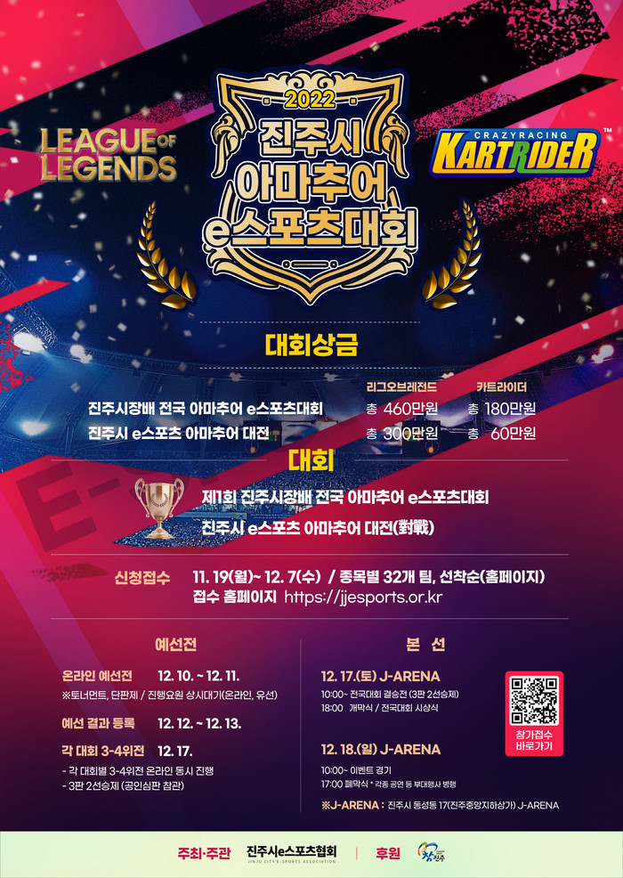 [프레스뉴스] 정재훈 기자= 진주시 e스포츠협회가 주최하고, 진주시와 경상국립대학교가 후원하는 ‘2022 진주 아마추어 e스포츠대회’가 오는 17일과 18일 진주 중앙지하도 상가 e스포츠 커뮤니티센터 J-ARENA에서 열린다.