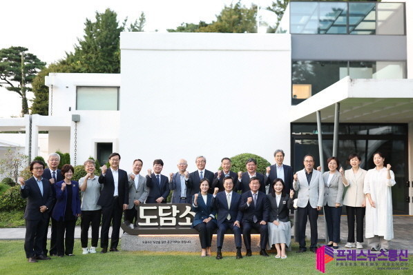 | ▲27일 도담소에서 열린 제2기 도정자문위원회에서 김동연 경기도지사와 전해철 도정자문위원장 등 참석자들과 기념촬영을 하고 있다.(사진=경기도) |
