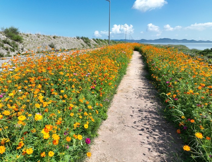 [진도=프레스뉴스]신상균 기자= 진도군은 나리방조제(3.2km) 일원에 조성한 꽃길에 가을꽃들이 만개해 주민과 관광객들의 큰 호응을 얻고 있다고 밝혔다.