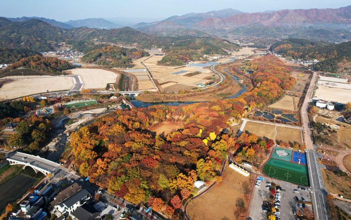 | ▲ 천연기념물 제154호로 지정된 함양 상림공원의 절정에 이른 단풍(사진=함양군) |