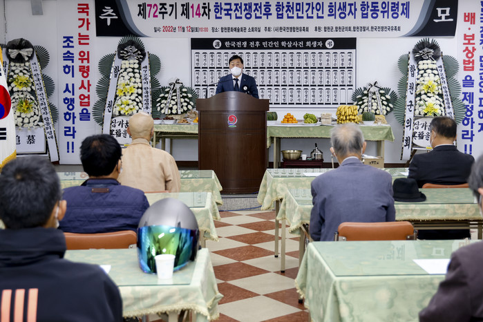 [프레스뉴스] 정재훈 기자= 합천군은 한국전쟁 전후 민간인 희생자 합천 유족회 주최로 지난 12일 오전 10시 합천읍 소재 문화예술회관에서 「제72주기 제14차 한국전쟁 전후 합천 민간인 희생자 합동위령제」를 개최했다고 14일 밝혔다.