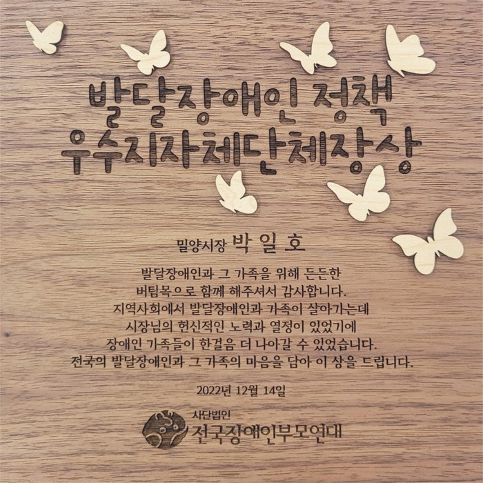 | ▲ 박일호 밀양시장 발달장애인 정책 우수지자체 단체장상 수상(밀양시 제공) |