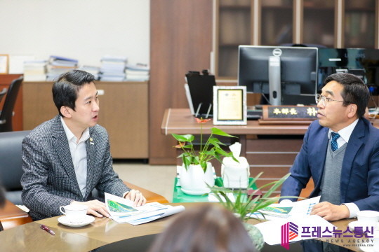 ▲안산시의회 송바우나 의장이 16일 한국산업단지공단 경기지역본부 관계자들과 간담회를 가졌다. 사진 왼쪽이 송바우나 의장, 오른쪽은 한국산업단지공단 박진만 경기지역본부장. (사진= 안산시의회) |