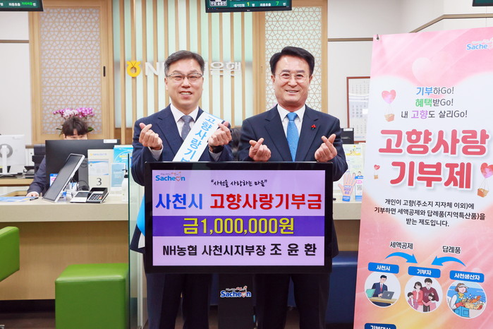 조윤환 지부장은 “내 고향 사천시 발전에 보탬이 될 수 있어 기쁜 마음으로 기부에 참여하게 됐다”며 “고향사랑기부제가 고향과 기부자 모두에게 도움되는 좋은 정책인 만큼 성공적으로 안착될 수 있도록 농협이 함께 하겠다”고 말했다.
