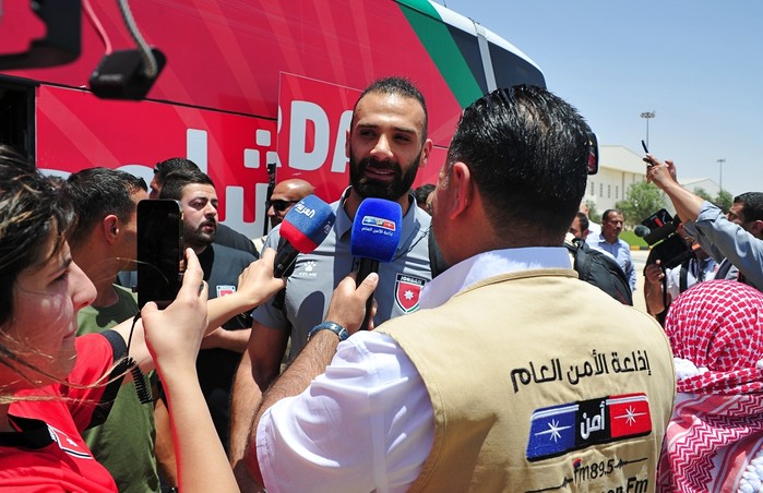 [프레스뉴스] 채정병 특파원=5일(현지시간) 오만의 무스카트 술탄 스포츠 스타디움에서 열린 국제축구연맹(FIFA) 2026 북중미 월드컵 아시아지역 3차 예선 9차전에서 오만을 3-0으로 제압하면서 요르단 역사상 최초로 월드컵 본선진출권을 획득한 요르단 축구대표팀이 요르단 퀸 알리아 국제공항에 도착한 가운데 FC 서울에서 뛰고 있는 야잔 알 아랍이 요르단 언론과 인터뷰를 하고 있다.