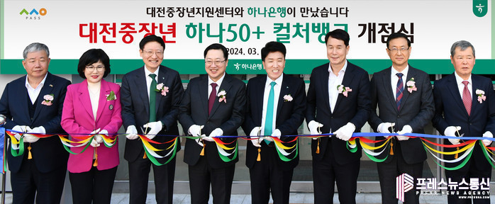 이날 「하나 50+ 컬처뱅크」 개점식 행사에는 이장우 대전시장과 이상래 대전시의장, 민경배 대전시의원을 비롯해 함영주 하나금융그룹 회장과 이승열 하나은행장, 임영진 성심당 대표이사 등이 참석해 이번 「하나 50+ 컬처뱅크」 개점을 축하했다.