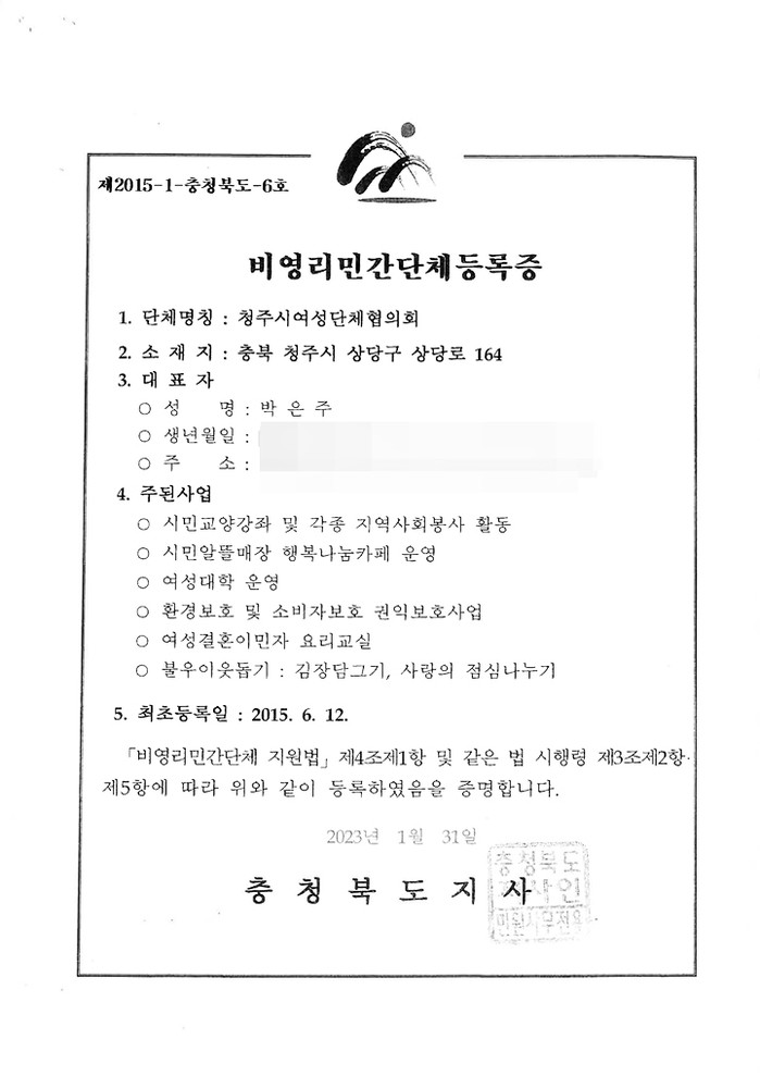 | ▲ 청주시여성단체 비영리민간단체등록증 |