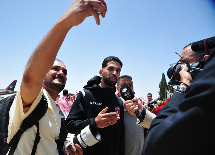 [프레스뉴스] 채정병 특파원=5일(현지시간) 오만의 무스카트 술탄 스포츠 스타디움에서 열린 국제축구연맹(FIFA) 2026 북중미 월드컵 아시아지역 3차 예선 9차전에서 오만을 3-0으로 제압하면서 요르단 역사상 최초로 월드컵 본선진출권을 획득한 요르단 축구대표팀이 요르단 퀸 알리아 국제공항에 도착한 가운데 헤트트릭을 기록한 알리올완이 요르단 언론과 인터뷰를 하고 있다.